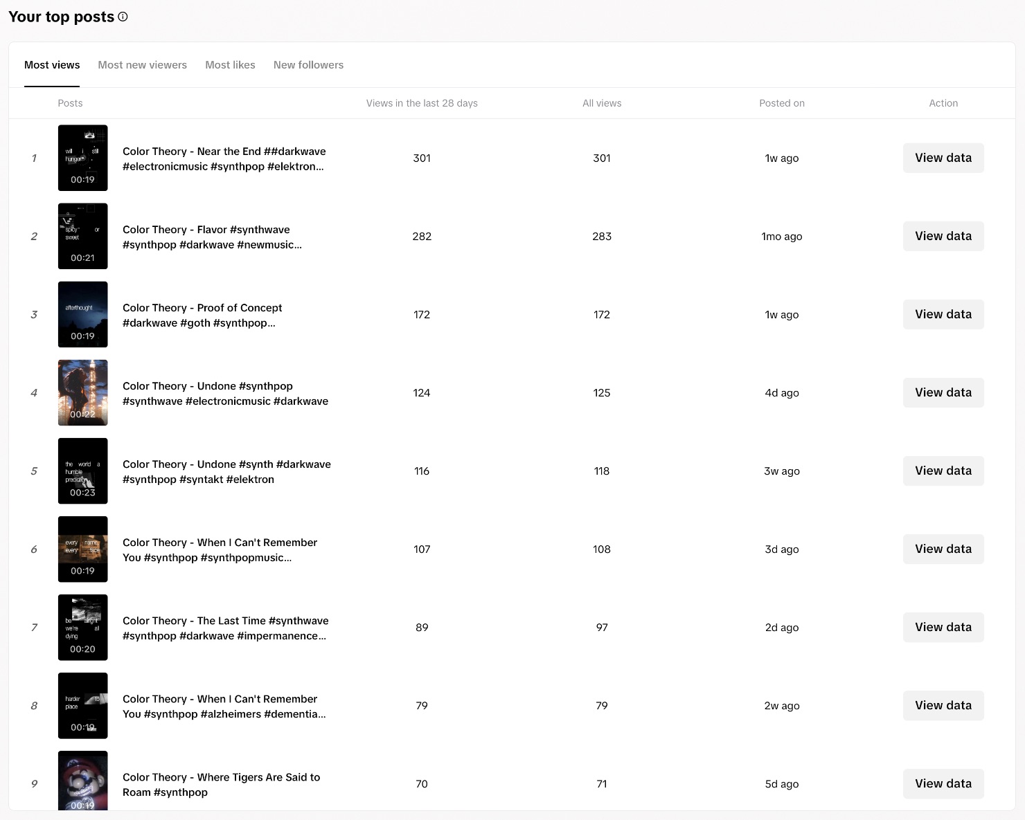 I created new accounts on TikTok and Instagram with branding to match our co-op playlist. Before posting on TikTok, I watched some synthpop-related content to teach the algorithm who to share my posts with, because apparently that’s how it’s done. It’s not about who you follow, but what you consume.
